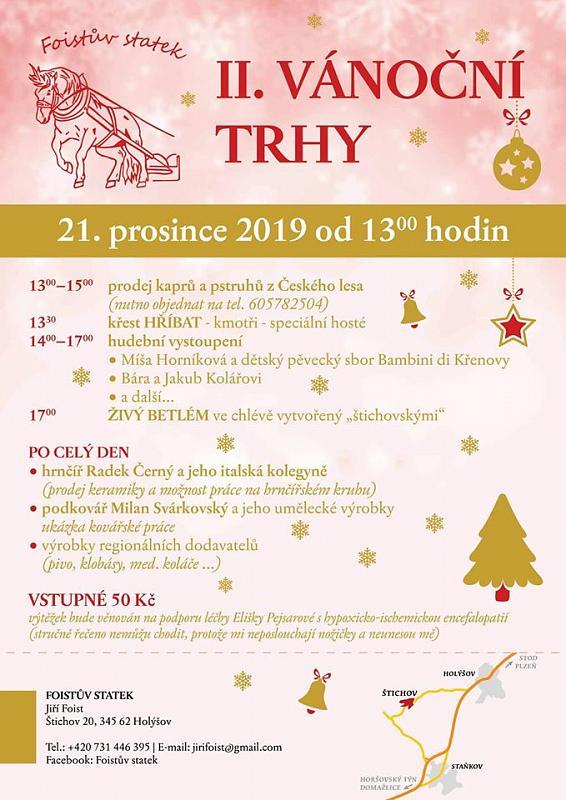 V sobotu 21. prosince 2019 pořádal Foistův statek II. Vánoční trhy. Na celé odpoledne byl připraven doprovodný program. Jako první na řadě byl křest hříbat, kobylky Black and white a hřebečeka Bleska McQueena. Poté následovalo pěvecké vystoupení Míši Horníkové a dětského pěveckého sboru Bambini di Křenovy, dále Barbory a Jakuba Kolářových. Od 17 hodin pak proběhl Živý betlém ve chlévě v podoání "štichovských" (Terezka, Helena a Václav Weisovi, Zuzana Němejcová, Adéla Weisová, Marktéa Bauerová, David Bauer, Jaroslav Roučka, Věra, Lilinka a Jan Mandíkovi, Julinka a Štěpánka Volenovi, Emička, Jonášek a Milan Šauerovi, Lenka Chvojková, Ondrášek, Andrea a David Bauerovi, Jana a Jaroslav Šimkovi, Simona a Jindřich Vávrovi, Barbora a Kuba Kolářovi, Jiří Foist, Jiří Liška, Marie Roučková, Marie Krammerová a Jarmila Veselá). Během dne si návštěvníci mohli zakoupit kapry a pstruhy z Českého lesa či výrobky regionálních dodavatelů. Mohli shlédnout výrobu podkováře Milana Svárkovského či práci hrnčíře Radka Černého a jeho italské kolegyně. Celý výtěžek z akce byl věnován na podporu léčby Eličky Pejsarové z Křenov, která se léči s onemocněním hypoxicko-ischemickou encefalopatií (stručně řečeno nemůže chodit, protože jí neposlouchají nožičky).