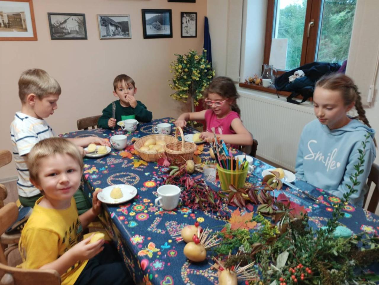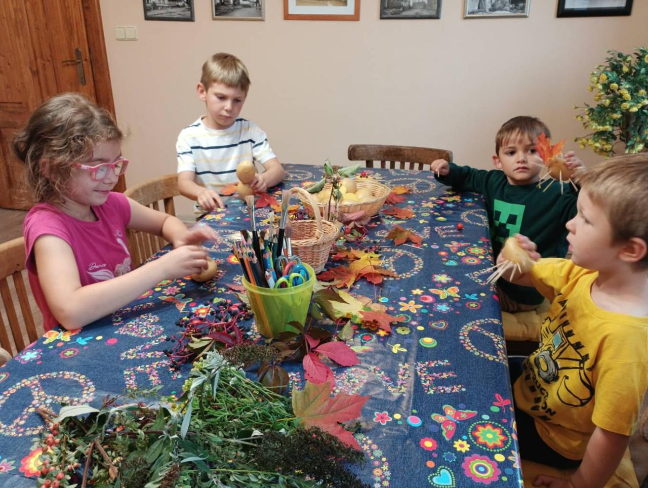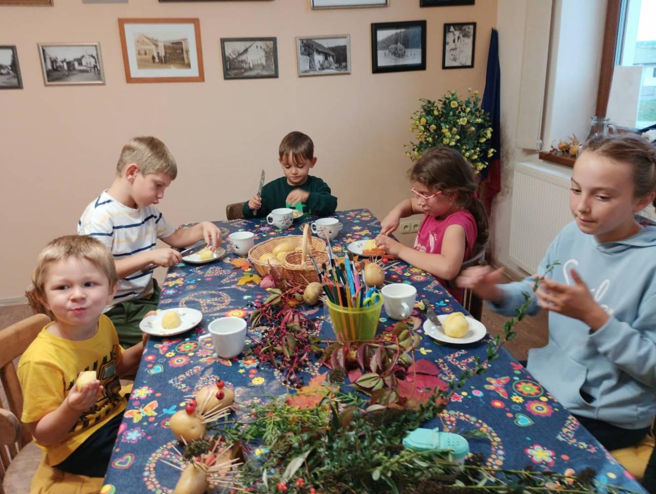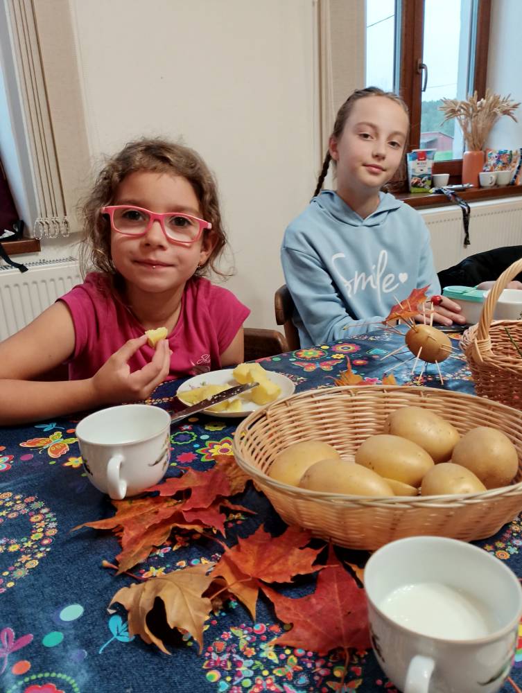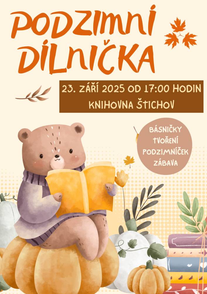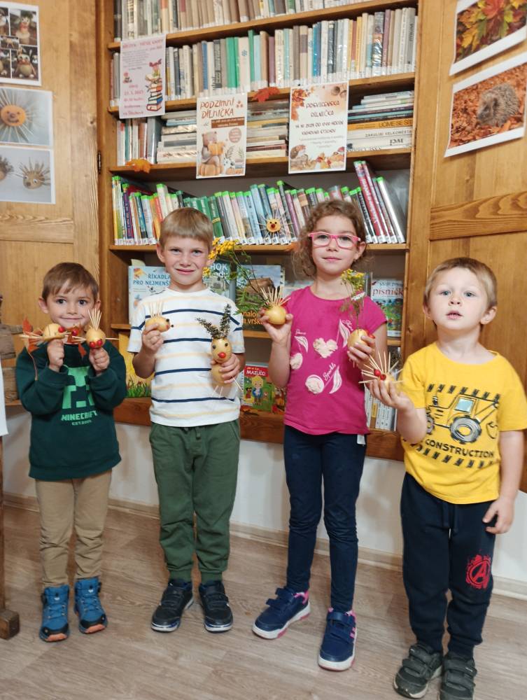 Třetí zářijové úterý, 23. 9. 2025, patřilo ve štichovské knihovně dětem. Na programu bylo čtení podzimních básniček a říkanek. Děti si také vyrobily podzimníčka z brambor a podzimních plodů (šípek, kaštany, trnky, suché trávy apod.). Pochutnaly si i na vařených bramborách "na loupačku" s mlékem. Na úplný závěr si každé dítko vypůjčilo knížku, kterou si doma s rodiči nebo samo přečte. Byl to velmi příjemný podvečer a už se těšíme na další setkání. Foukej, foukej, větříčku, shoď mi jednu hruštičku. Shoď mi jednu nebo dvě, budou sladké obě dvě. Kutálí se ze dvora, (meleme rukama) velikánská brambora.(kroužíme současně oběma nataženýma pažema) Neviděla(zakryjeme oči), neslyšela, (zakryjeme uši) že na ni padá závora. (spojené ruce v předpažení plácnou do stehen) Kam koukáš ty závoro? (ukazováčkem děláme tytyty!) Na tebe ty bramboro! (ukazujeme na sebe) Kdyby tudy projel vlak, (pokrčené ruce podél těla jako mašina) byl by z tebe bramborák. (tleskáme)